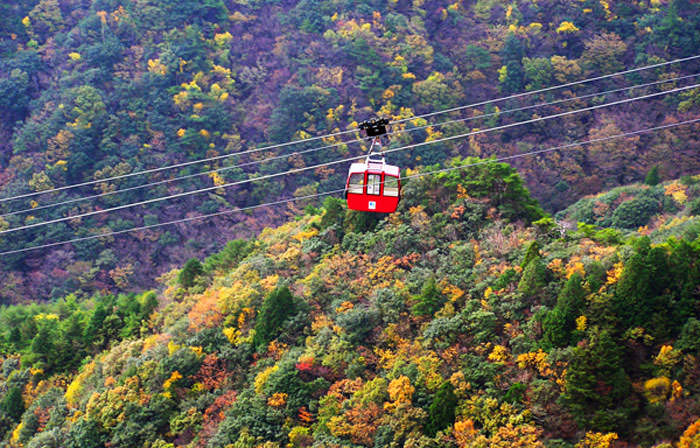 中腹は、色とりどりの葉っぱに覆われ、天然のカーペットのような秋の色に。